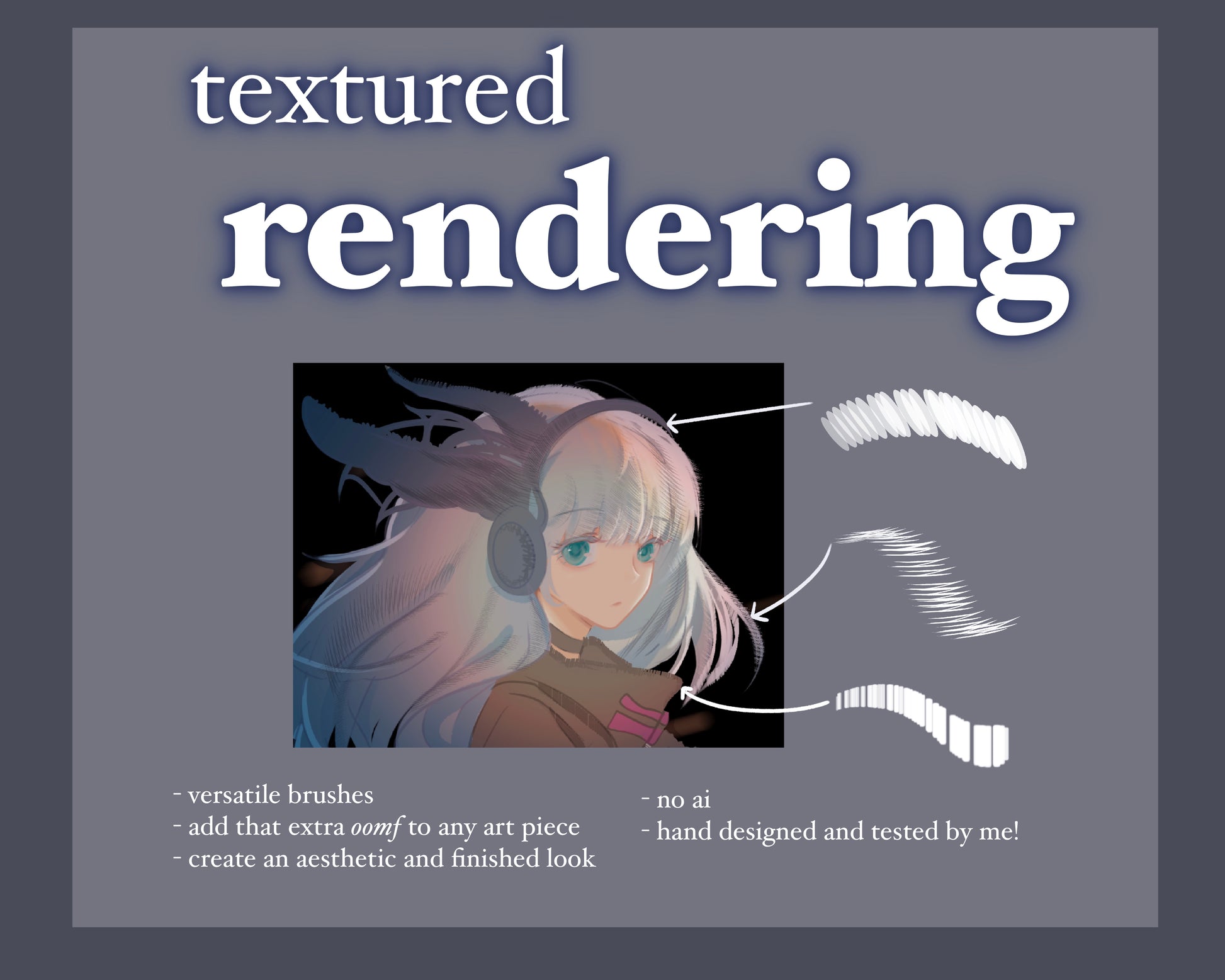 The "Textured Rendering" brush set was designed and hand-tested by me (viyaura!) because every drawing ccanuld use some extra textures for a perfect finished render! It makes the entire drawing pop even more and truly more unique :)
